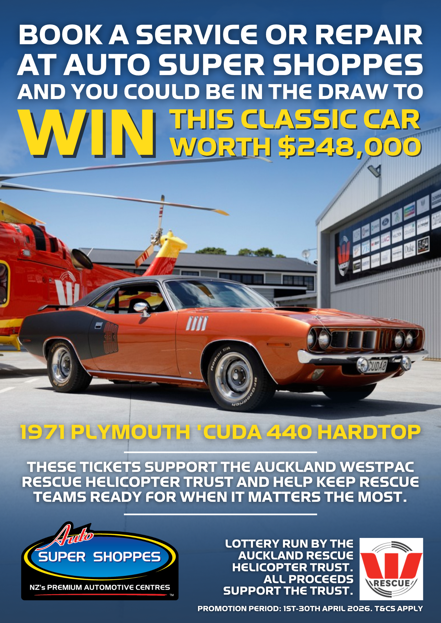 - The prize is one ticket into the Auckland Westpac Rescue Helicopter Trust Car Lottery, where the featured prize is a 1971 Plymouth ’Cuda 440 Hardtop valued at approximately $248,000.